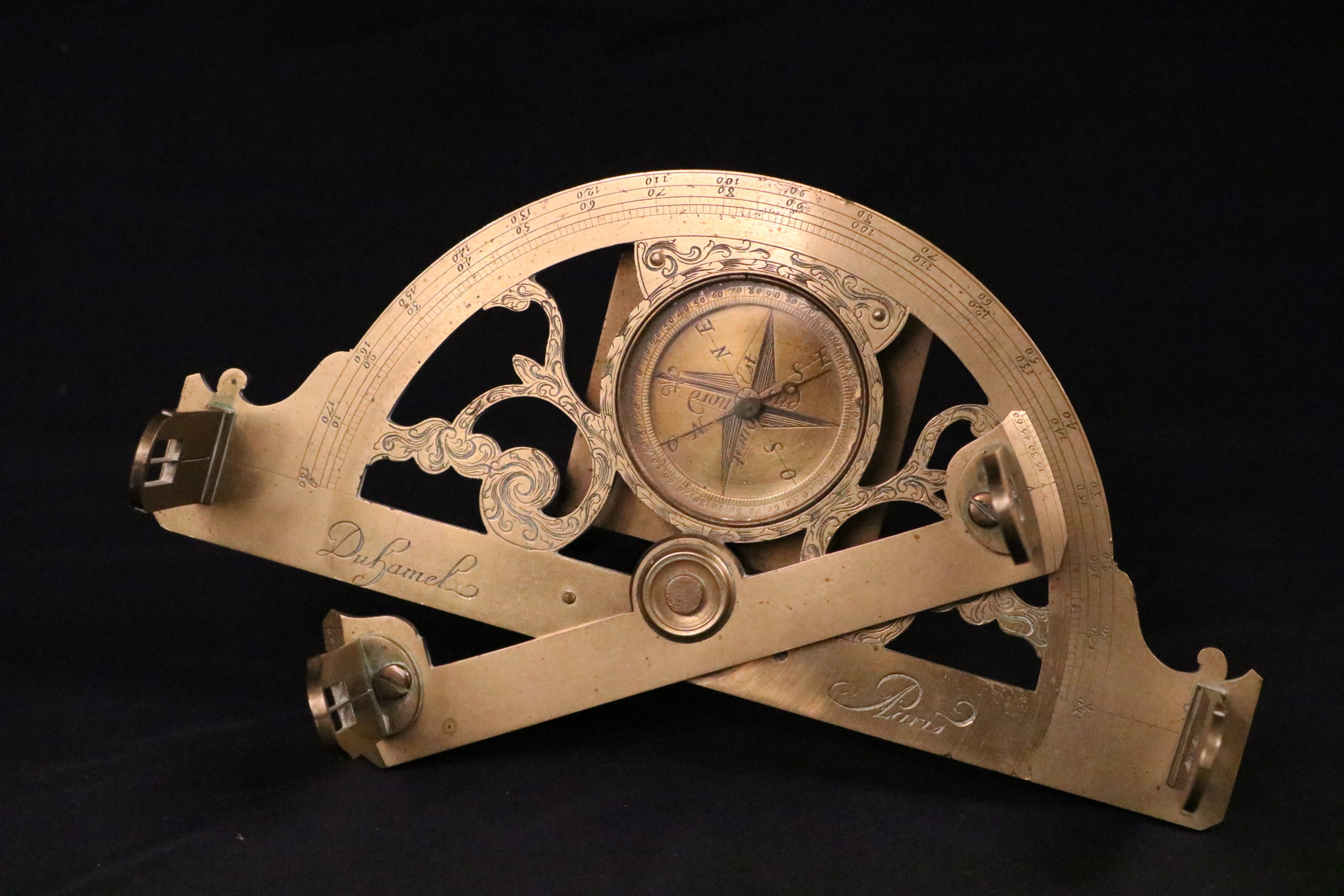 Inventé à la fin du 16e siècle par le fabricant français d’instruments Philippe Danfrie (1534-1606), le graphomètre à pinnules est le modèle le plus utilisé, particulièrement en France, jusque dans les années 1760, période à partir de laquelle il est progressivement remplacé par le graphomètre à lunettes. Le graphomètre à pinnules devient d’usage courant pour les géomètres à partir du 18e siècle seulement : en cela, il est représentatif du progrès des techniques à la période des Lumières. Il servait à des mesures d’arpentage et de topographie, en relevant les angles entre objets situés sur un même plan, horizontal ou vertical. Il accompagne les progrès de la cartographie, des relevés à usage juridique, des tracés des canaux et des routes… Le graphomètre servit notamment à l’établissement de la carte du royaume de France (la carte de Cassini) au milieu du 18e siècle. Selon l’Encyclopédie, les « pinnules servent à mettre l’alidade dans la direction de l’objet qu’on se propose d’observer, & que les fentes servent à en faire discerner quelques parties d’une manière bien déterminée; c’est pourquoi ces fentes ayant un peu de largeur, pour laisser voir plus facilement les objets, portent un cheveu (ou une fine lame de métal) qui en occupe le milieu depuis le haut jusqu’en bas ». La mesure de l’angle formé par l’alidade fixe et l’alidade mobile est lue sur la graduation du limbe. Une boussole permettait l’orientation pour les usages en position horizontale.