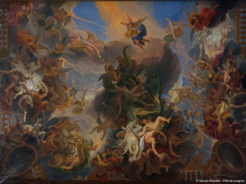 Le tableau de Langres correspond à environ deux-tiers de l’ensemble de la composition, délimitée par une balustrade. Situé du côté de l’autel, l’autre tiers représente Dieu dans sa gloire. Ici, la composition, complexe et profuse, s’organise autour de saint Michel qui foudroie un monstre à sept têtes symbolisant les sept péchés capitaux. Plus bas tombent trois figures : le diable (tenant un sceptre), la Chair (en blanc) dominée par la lubricité et le Monde (de dos) entrainé dans sa perte par la débauche. Autour de saint Michel, les Anges sonnant de leurs trompettes annoncent le triomphe de Dieu et poussent les Anges rebelles dans leur chute. Sur les côtés, les Vertus tenant des boucliers combattent les Vices.