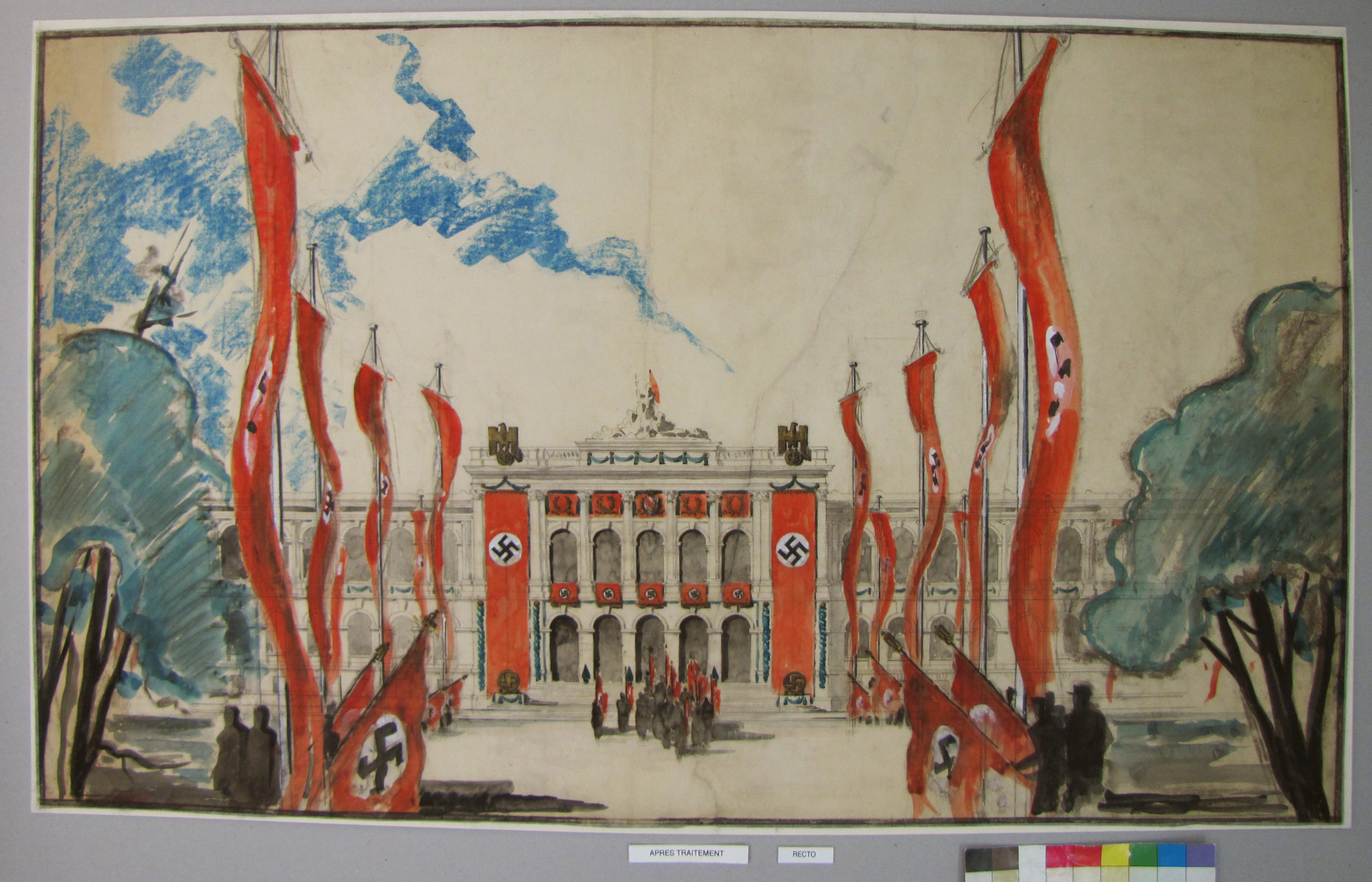 6 dessins sur calque relevés de gouache figurant la façade du palais universitaire de Strasbourg lors de son inauguration par les nazis le 24 novembre 1941 en tant que Reichsuniversität.