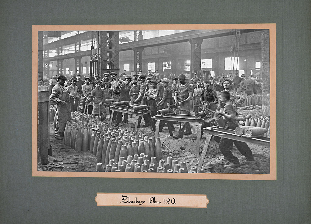 Album photographique réunissant 57 photographies prises pendant la période 1911-1918 illustrant l’activité sidérurgique Delattre et Frouard et la production d’obus pendant la guerre.