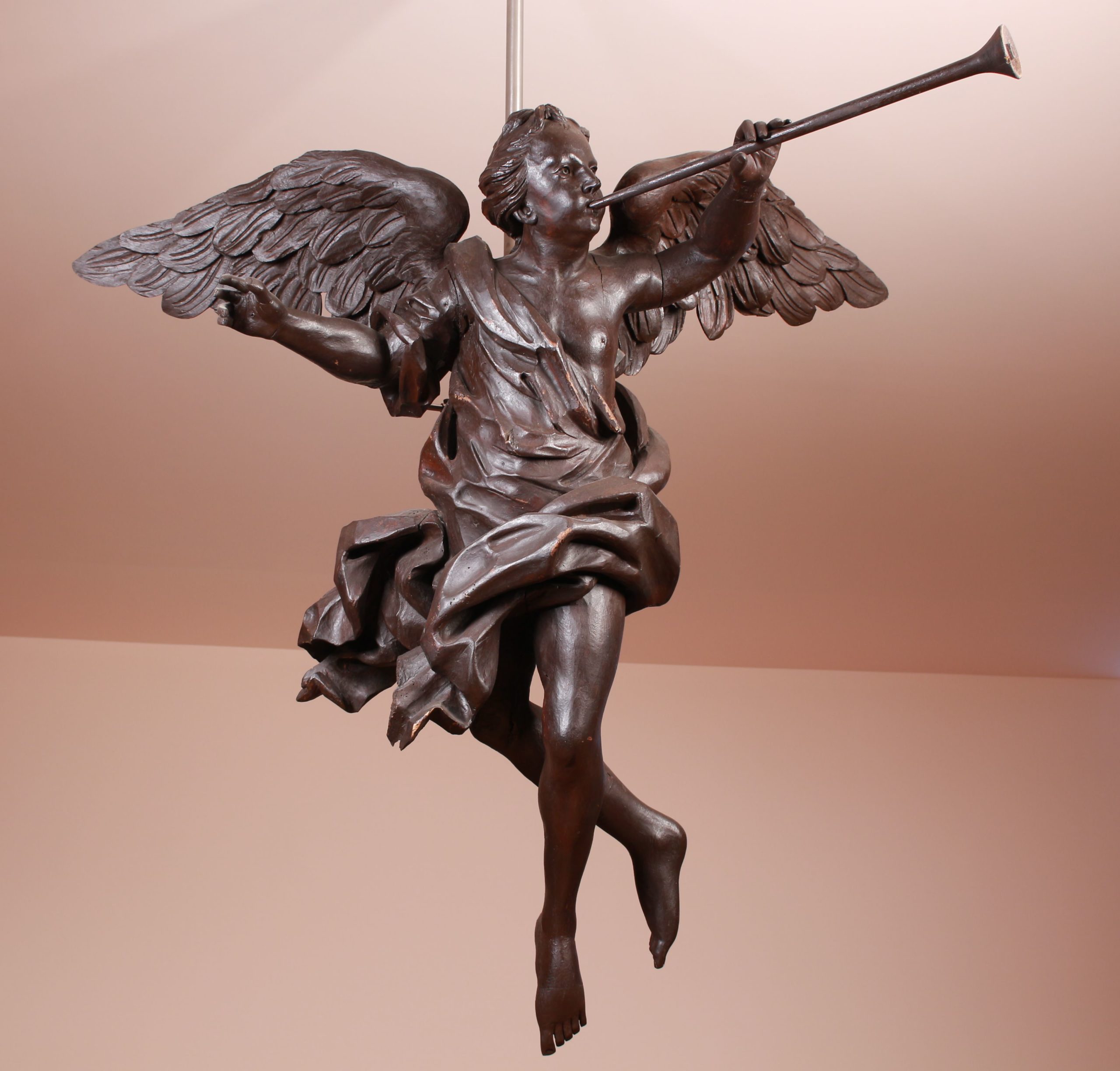 Ange représenté avec vigueur flottant dans les airs, les ailes déployées soufflant dans une trompette tenue par sa main gauche. Son vêtement drapé laisse l’épaule gauche nue. Il est traité avec beaucoup d’énergie apportant légèreté et mouvement à l’ensemble alors que la plénitude de la forme avec ses ailes déployées confère à cette représentation une grande stabilité. Cette sculpture religieuse couronnait la chaire de l’église Saint-Barthélémy reconstruite au 18e siècle à Sarrebourg. Une partie de la chaire se trouve encore sur place. Son auteur, Dominique Labroise (1728-1808) est un sculpteur né à Sarrebourg où il crée un atelier familial qui produira de nombreuses boiseries et sculptures notamment pour les églises de la région.