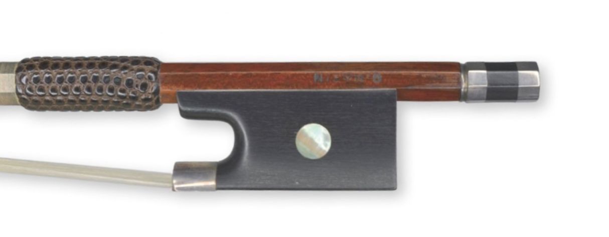Archet de violon monté argent. La baguette est ronde, en bois de pernambouc.Archet de violon monté argent.