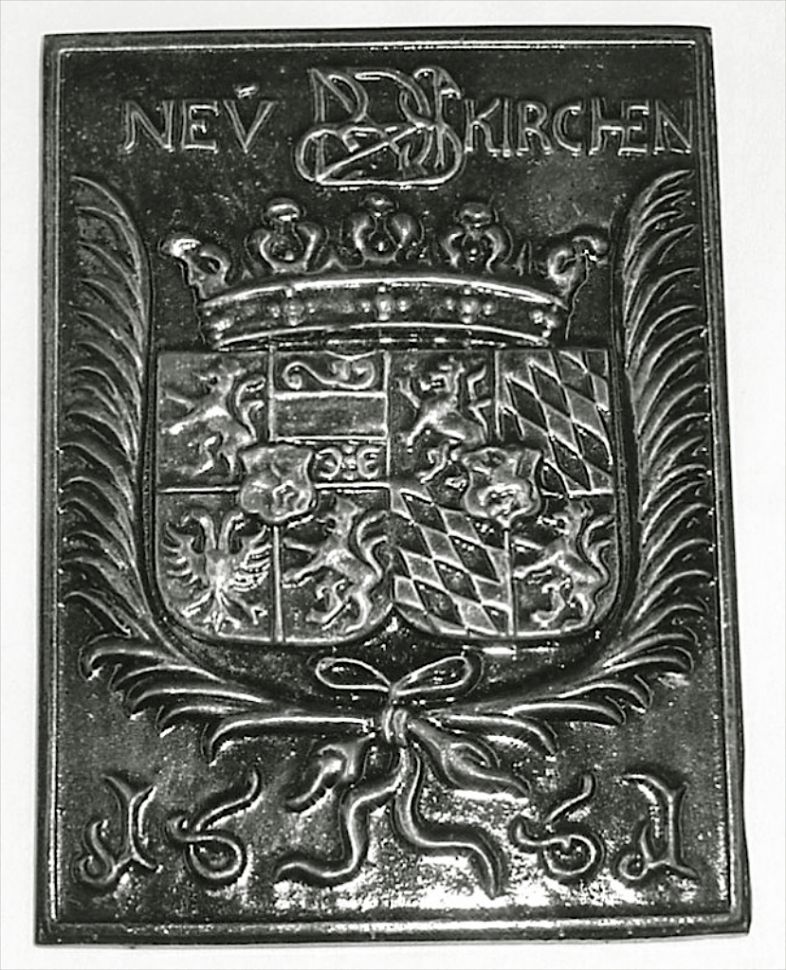Petite plaque rectangulaire en fonte moulée aux bords moulurés. La plaque présente les armoiries du comte Johann Ludwig de Nassau-Sarrebrück-Ottweiler (mort en 1690) et de son épouse Dorothea Catharina von Pfalz-Zweibrücken. Réalisée à partir d’une plaque de poêle originale fondue en 1661 à la fonderie de Neunkirchen. Muni au dos d’un crochet d’attache.