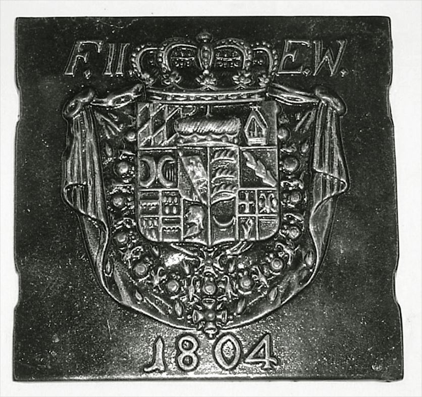 Petite plaque carrée en fonte moulée présentant deux décochements sur chacun de ses côtés latéraux. La plaque présente les armoiries du Prince Frédéric II du Würtemberg. La plaque originale mesure 59 x 58 cm. Réalisée à partir d’une plaque originale datée de 1804, coulée dans une fonderie du sud de l’Allemagne. Les initiales moulées en haut de la plaque signifient « FRIDERICUS SECUNDUS ELECTOR WIRTEMBERGENSIS », soit Frédéric II, Prince Electeur du Würtemberg. Muni au dos d’un crochet d’attache.