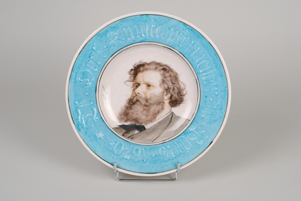 Portrait 3/4 gauche de Th. Deck. Marli bleu Deck avec inscription en relief: « TH. DECK KUNSTTOPFERMEISTER IN PARIS ». Portrait identique au dessin 985.3.1.