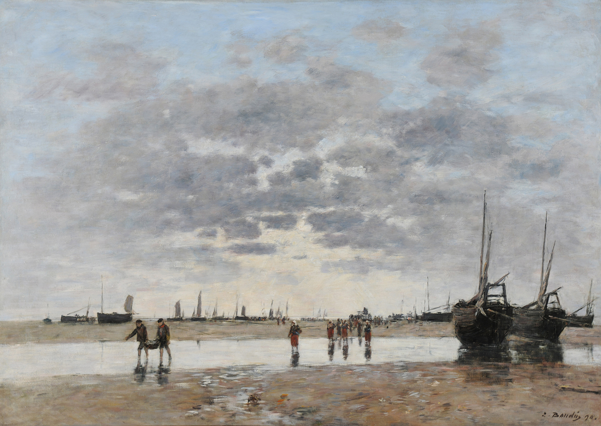 Les pêcheurs ont quitté leur bateau dont les voiles se balancent au loin, à marée basse. Le sable humide reflète les personnages du premier plan, un ciel immense les éclaire. Sur la ligne d’horizon les nuages semblent s’éparpiller. Henry Vasnier a rencontré Boudin, il l’apprécie et lui achète treize peintures, souvent des ciels mouvants de bord de mer. De dimension identique, il existe une seconde toile représentant le même lieu, à marée haute — Berck : le départ des barques — elle aussi fut achetée par Vasnier et fait partie des collections du musée.