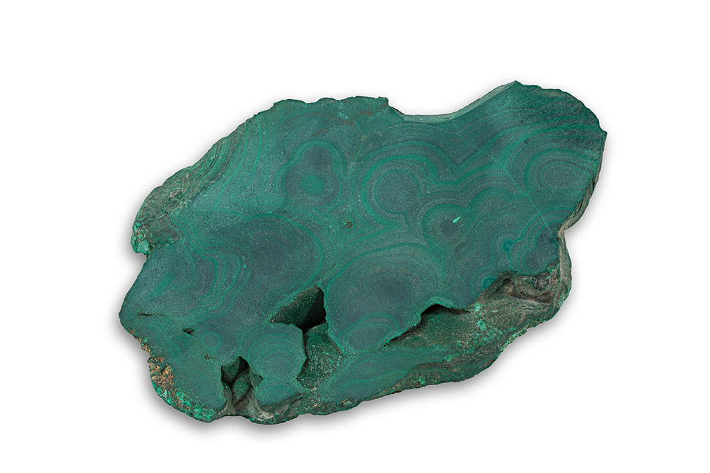 Ce bloc de carbonate de cuivre, appelé aussi malachite, est d’une belle couleur verte nuancée de teintes diverses. Sa surface est polie. Le carbonate de cuivre fait partie des minerais de cuivre les plus faciles à réduire pour produire du métal car il n’a pas d’autres composants que du carbonate et des oxydes de cuivre et fut sans doute parmi les premiers utilisés entre le milieu du 5e millénaire et le milieu du 4e millénaire avant J.-C.