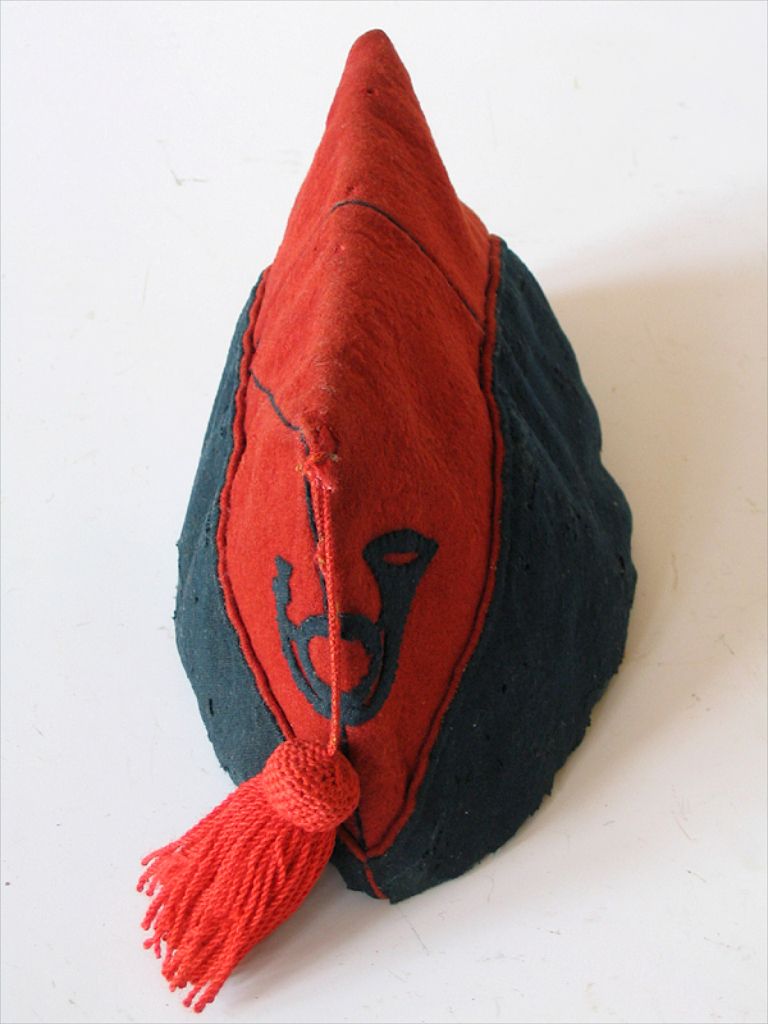 Bonnet de police en soufflet. Ce bonnet de police est confectionné en drap garance avec passepoils bleu foncé autour du bandeau et à la couture arrière, les rabats sont bleu foncé, les passepoils dessinent sur la flamme une pointe qui s’engage sous le côté droit du bandeau, l’avant du bandeau porte un cor de chasse bleu foncé, un gland garance avec double cordon de suspension est suspendu sur l’avant du bonnet, l’intérieur de la coiffe est en basane.