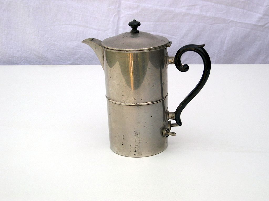 Cylindrique en métal chromé, poignée fermée en bois ouvragé, deux broches mâles pour cordon d’alimentation, petite poignée en bois sur couvercle.