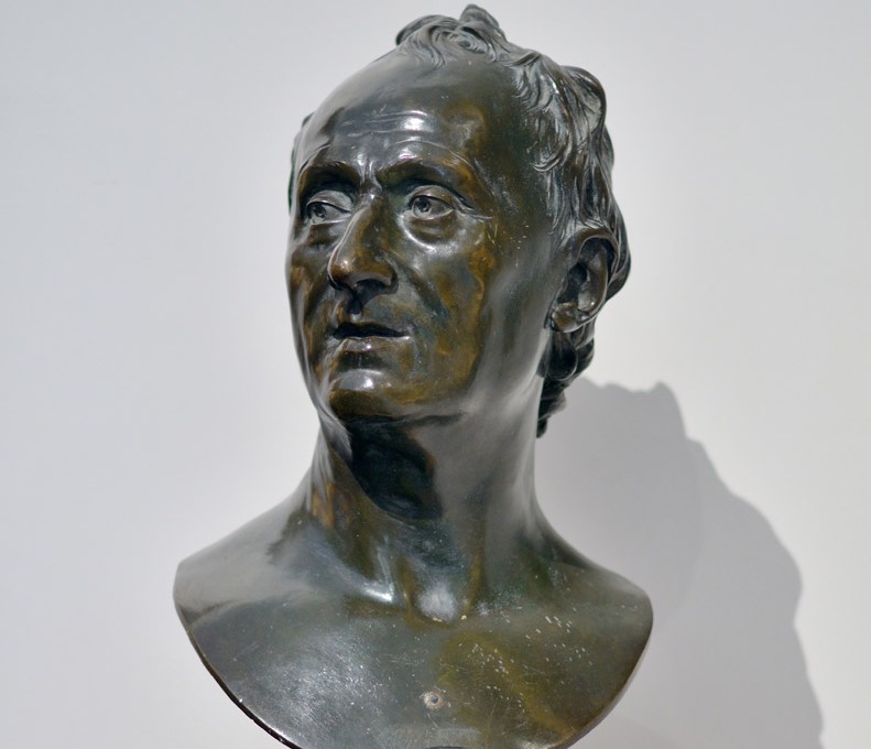 Ce buste de Diderot par Jean-Antoine Houdon porte l’inscription « Denis Diderot, à ses concitoyens ». Il fut offert en 1780 par Diderot lui-même à ses concitoyens, à la demande de la municipalité. Selon une lettre qu’il adresse à sa fille, les officiers municipaux reçurent en même temps cinq tirages en plâtre du même buste. L’œuvre est éditée en bronze d’après la terre cuite présentée par Houdon au Salon de 1771, sans doute à la suite d’une commande du prince Galitzine, ambassadeur de Russie à la cour de France et ami de Diderot. Le sculpteur a voulu représenter le philosophe en homme de vérité et d’expérience, dans une attitude volontaire, avec un regard franc. Cette œuvre semble avoir plu à Diderot qui la trouvait ressemblante. Par rapport à la terre cuite, conservée au Louvre, le bronze montre cependant Diderot un peu plus vieilli, avec des rides accentuées.