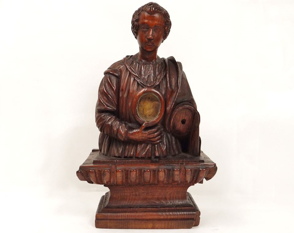 Buste en bois sculpté d’un jeune homme probablement Saint Jean portant autour du cou un grand médaillon vitré et doré à l’intérieur. Le personnage se tient droit de face, ses cheveux sont courts et ondulés avec des mèches marquées jusqu’aux lobes. Les sourcils sont légèrement incisés. Les yeux en amande ont un iris. Le nez est droit. Les joues sont relativement plates. La bouche fermée se compose d’une lèvre inférieure plus épaisse que la supérieure. Il semblerait que le personnage esquisse un petit sourire. Sa tête repose sur un cou assez fin. Il est habillé d’une chemise à manches longues recouverte d’une tunique à manches courtes. Au niveau de la taille, une corde nouée par l’avant cintre le vêtement. Un drap, probablement un manteau recouvre le bras et l’épaule gauche du personnage puis retombe à l’arrière, sur le dos. Les plis sont fins et nombreux. Ils suivent les courbes du corps. Son bras droit est plié, la main tient un grand médaillon. Ce dernier est porté autour du cou par une corde disproportionnée. Le buste repose sur un socle quadrangulaire mouluré, incurvé dans sa partie médiane et décoré d’une frise d’oves dans sa partie supérieure.