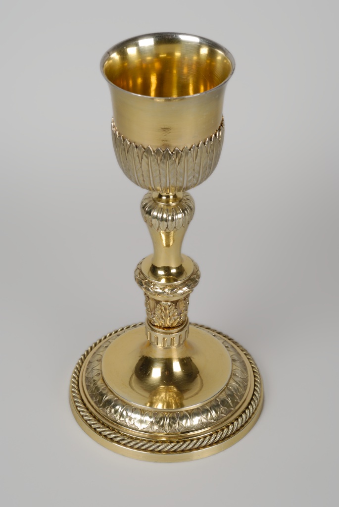 Argent doré, poinçonné. Décor thème de la feuille. Atelier en activité à Strasbourg de 1771 à 1789. Tradition artisanale séculaire à Strasbourg, l’orfèvrerie y a connu, depuis le rattachement de la ville à la France en 1681, un spectaculaire essor, participant, plus généralement, de celui des arts décoratifs. Le XVIIIème siècle fut, pour les orfèvres, élite de la corporation de « l’Echasse », jouissant de longue date d’une considération et d’une aisance financière particulièrement notables … un véritable âge d’or. Ayant réussi, lors de la «capitulation» de 1681, à conserver le titre de l’argenterie du Saint-Empire qui, légèrement plus bas que celui de Paris, permettait une meilleure adhésion de l’or et donc garantissait la qualité et la solidité du vermeil, les orfèvres bénéficièrent amplement de l’afflux de nouvelles clientèles dû au changement politique de la cité: la réintroduction du culte catholique leur donna l’occasion de fournir les églises en calices, ostensoirs, reliquaires, nécessaires de messe. L’afflux d’une société aristocratique venant occuper des postes militaires ou civils récemment créés, eut pour conséquence les commandes de nécessaires de toilette, de couverts armoriés, d’écuelles à bouillon, de nécessaires de chasse … livrés en général dans d’ingénieux écrins de cuir, autre spécialité strasbourgeoise. Les ateliers les plus réputés sont aux mains de dynasties familiales, comme celles des Imlin, des Kirstein, des Fritz, dont les échoppes sont concentrées en principe dans la rue des Orfèvres et dont les demeures d’habitation sont parfois fort belles, telle la maison des Imlin, 30 place Kléber, édifiée en 1748 dans le style rocaille strasbourgeois.