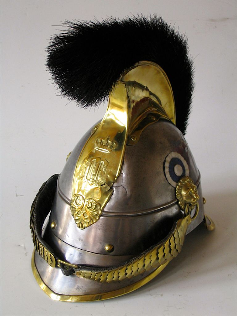 Casque à haut cimier de laiton portant une chenille de crin de cheval noir, son masque est orné d’un « M » gothique couronné, le haut du masque est percé d’une aération en forme de croix, la visière et le couvre-nuque sont bordés de laiton et rivés sur une large bande de fer formant un turban, la bombe est également emboîtée sur ce turban, les jugulaires sont à écailles plates découpées de 5 festons, elles sont fixées au casque par des rosaces en forme de muffles de lion, la rosace gauche est surmontée d’une cocarde aux couleurs de la Bavière (bleu et blanc), la coiffe est faite d’une large bande de basane sur laquelle est cousue une poche de cuir à 8 dents de loup avec oeillets afin de permettre le passage d’un cordon de règlage.
