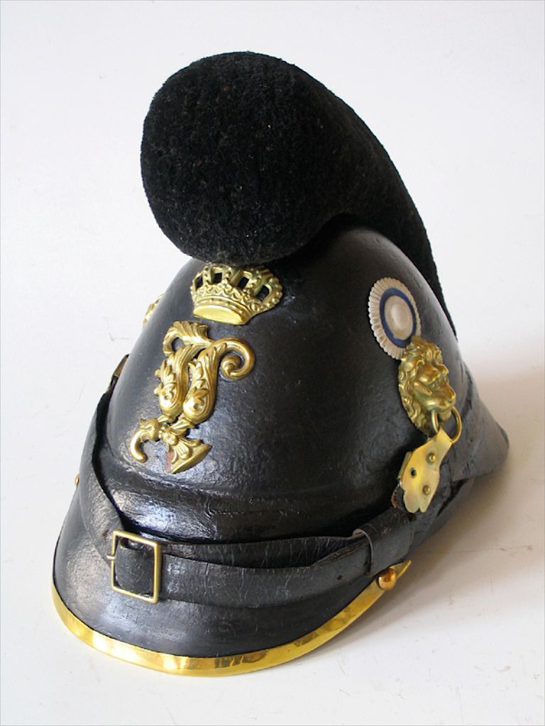Le casque à chenille mle 1868 a une bombe moins haute et plus arrondie que le modèle précédent, le couvre-nuque et la visière sont plus courts et cousus au bord inférieur de la bombe, cette dernière est ceinturée par un petit bourrelet de cuir qui forme un bourdalou, la jugulaire est en cuir et fermée par une boucle à ardillon, elle est fixée au casque par deux muffles de lion, le muffle de lion gauche est surmonté d’une cocarde aux couleurs de la Bavière (bleu et blanc), la visière est bordée d’un jonc de laiton, la chenille est en laine noire, la coiffe en basane est taillée en 10 dents de loup, un « L » monogrammé et couronné orne l’avant du casque.