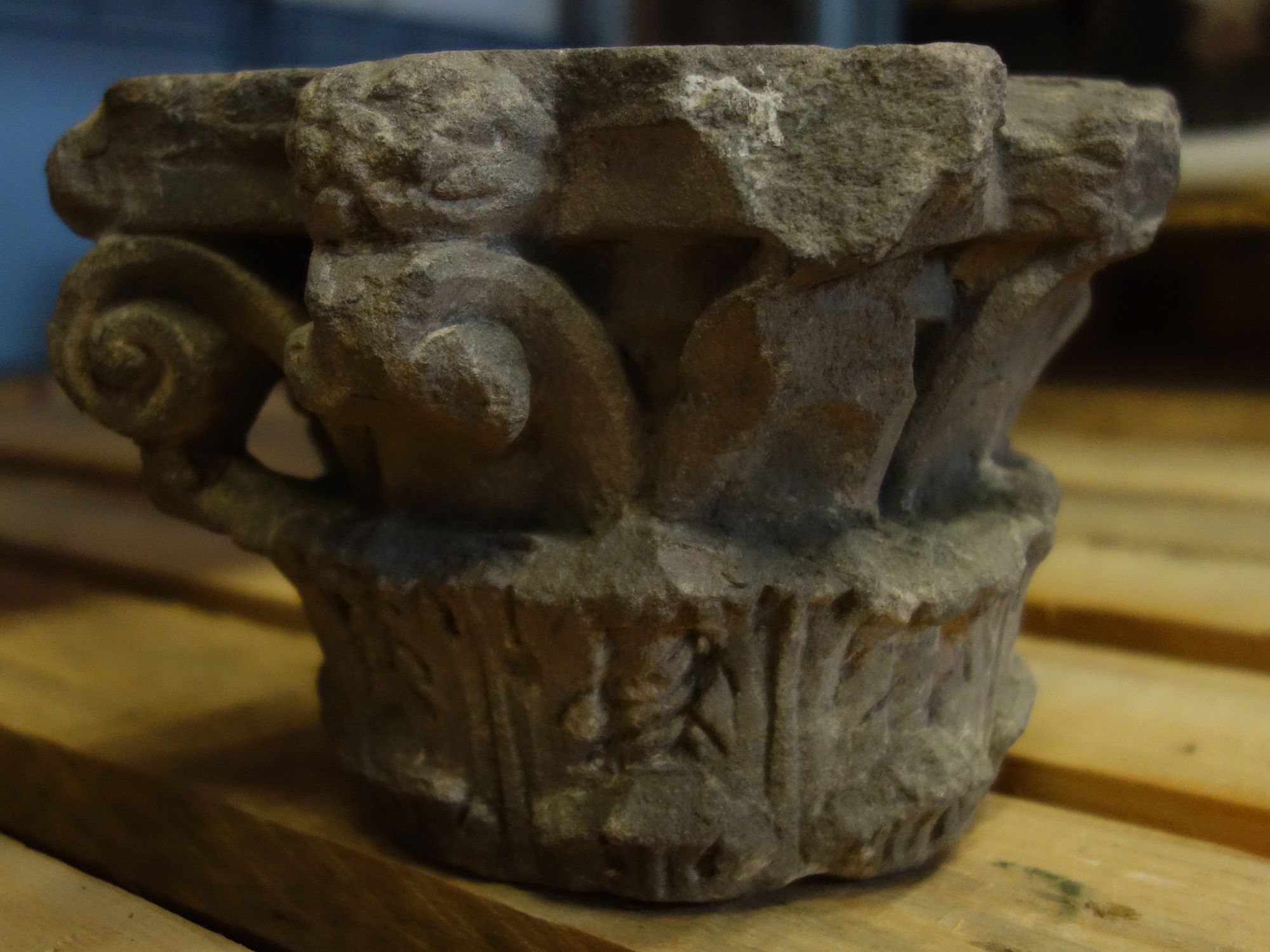 Chapiteau corinthien qui provient selon les registres de la Société pour la conservation des monuments historiques d’Alsace du chantier de construction d’un nouvel immeuble rue du Jeu des Enfants – rue du Vieux-Marché-aux-Vins à Strasbourg.