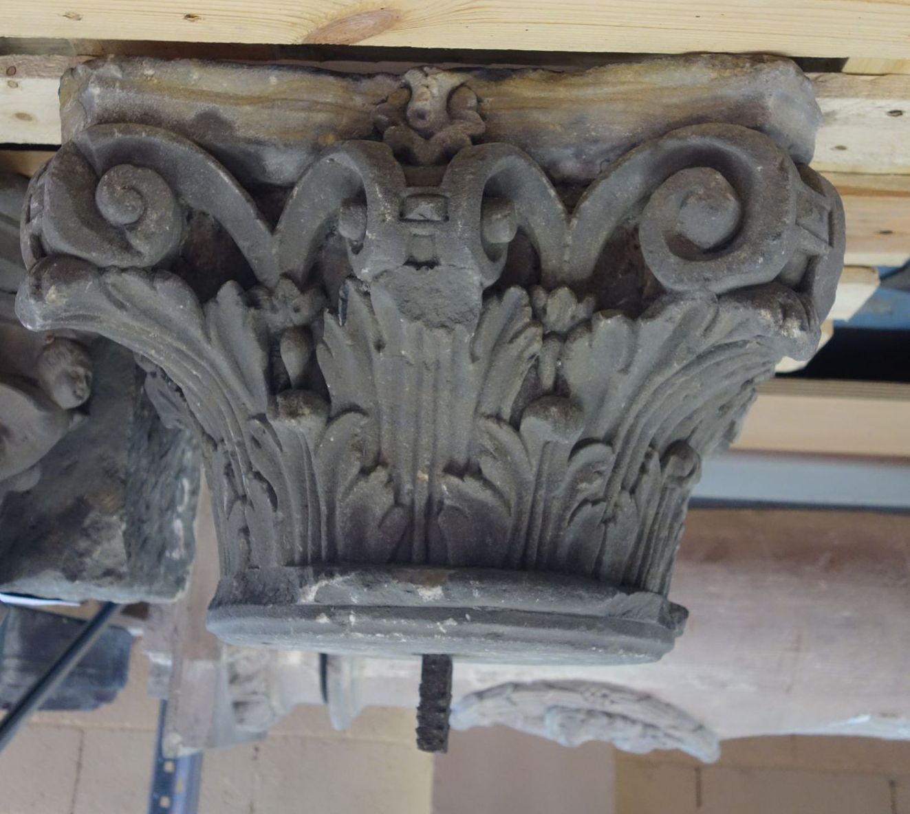 Chapiteau corinthien avec volutes d’angles et feuillage d’acanthes crossettes et fleur en dé.