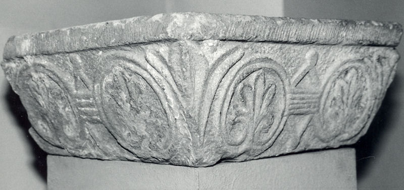 Chapiteau de pilier en pyramide inversé. Chaque face est sculptée de 2 palmettes juxtaposées séparées par 2 motifs de V opposés. L’abaque de faible hauteur et saillant présente des traces fines de ciseau droit (4 cm).