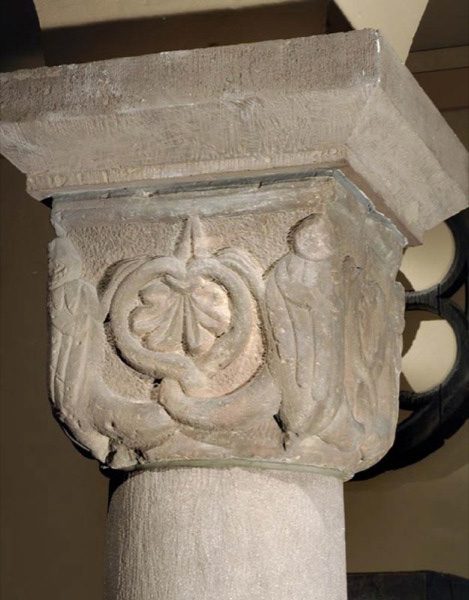 Chapiteau cubique, orné de dragons en moyen-relief. Leurs queues bifides se nouent au centre du chapiteau et encadrent une palmette qu’ils saisissent de leurs membres antérieurs. Le champ de la corbeille est piqueté. Les ailes des dragons présentent de fines traces de ciseau droit d’environ 2 cm. L’abaque est double et présente un bandeau sur un tore. Il est saillant. L’astragale assez fin est torique.