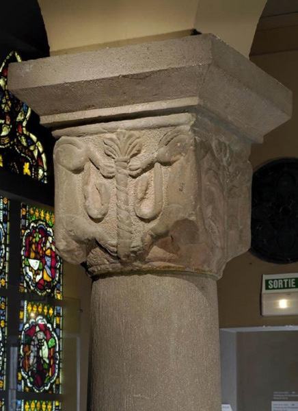 Chapiteau cubique, orné de lions en moyen-relief. Le champ de la corbeille est piqueté. L’abaque saillant est bombé. L’astragale est constitué de 2 tores superposés. Les lions tête en bas sont posés aux angles. Leurs 4 membres écartés tiennent sur chaque face, un motif végétal alternant d’une face à l’autre : un végétal au tronc torsadé surmonté d’une palmette, (sur ces faces sont représentées les queues des lions) ; un végétal (dont le tronc est constitué de 3 cordons et portant 4 feuilles) se termine par 4 feuilles également.
