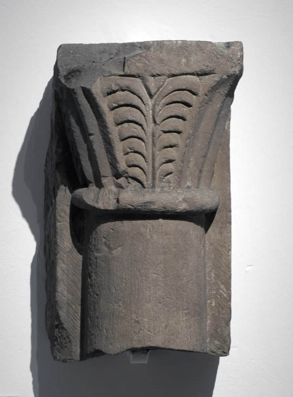 Chapiteau de colonne engagée en forme de pyramide inversée. Dans les angles feuille de palme à trois côtés encadrant un motif végétal. Astragale torique. Abaque faiblement saillant. Fragment de fût.
