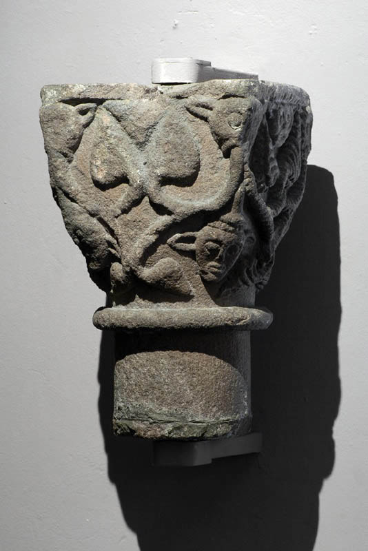 Chapiteau à têtes fantastiques. Rinceaux à feuillages entrelacés. A la partie inférieure, quatre têtes d’hommes barbus aux longues oreilles, coiffés d’un chapeau pointu (juifs ?). L’abaque saillant est droit et lisse ou dentelé suivant les faces. L’astragale est fin et saillant.