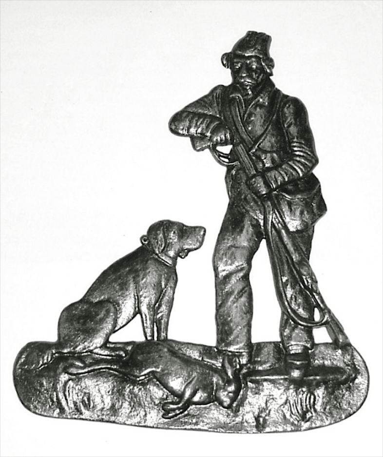 Bas-relief ajouré représentant un chasseur vu de face, tenant de sa main gauche son fusil devant lui, la crosse appuyée sur le sol. De sa main droite il le recharge de poudre provenant d’une petite poche qu’il porte en bandoulière. Le chasseur porte d’épaisses moustaches, il est vêtu d’une veste, un pantalon et un couvre-chef en forme de shako. Il porte une gibecière en bandoulière. Devant lui est assis son chien, de profil, le regardant. A ses pieds gît le lièvre qu’il vient d’abattre. Sur petit socle longitudinal. Réalisé à partir d’un modèle original non identifié.