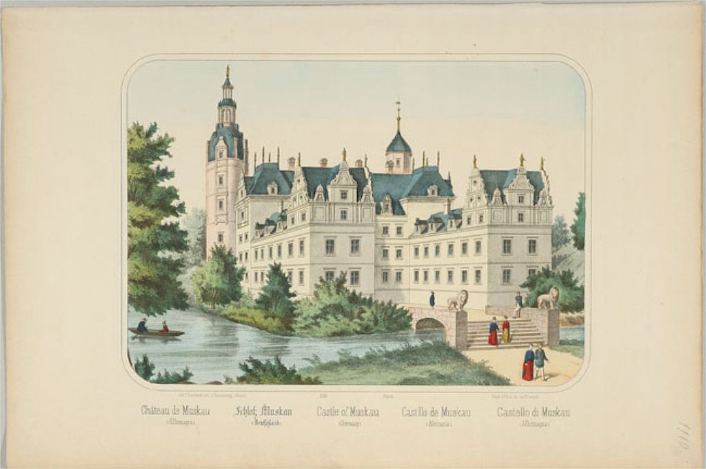 Château de Muskau (Allemagne). (titre inscrit, français, allemand, anglais, espagnol, portugais)