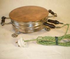 Chauffe-plat électrique en rond reposant sur trois pieds en forme de pattes de lion. Deux poignées e bois. alimentation par deux broches, cordon en textile vert.