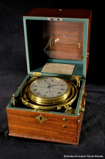 Le chronomètre de marine est l’une des inventions majeures du 18e siècle. Il permet de conserver l’heure exacte sur les navires durant les longues traversées. Associé au sextant, il sert à calculer la position en longitude, ce qui n’était pas possible auparavant. Le chronomètre de marine a été inventé et progressivement mis au point par l’horloger anglais John Harrison (1693-1776) entre 1736 et 1759. Les chronomètres sont embarqués couramment à partir de 1770 – 1780.