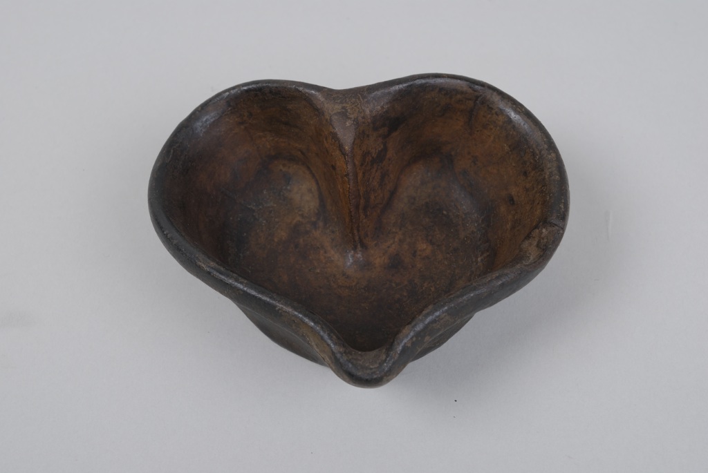 Moule en forme de coeur. Pièce façonnée à parois verticales et fond plat sans talons ou pieds. Sans décor et non vernissée. SP : proportions exceptionnellement petites.