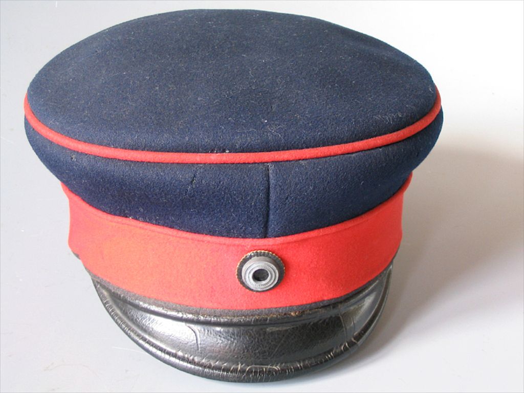 Casquette ronde composée d’un turban bleu marine avec un bandeau rouge vif, le calot bleu marine est séparé du turban par un passepoil rouge, la visière arrondie est en cuir noir sur sa face extérieure et en basane brun à l’intérieur, une cocarde aux couleurs de la Prusse (noir et argent) est fixée sur l’avant du turban, la coiffe est doublée en toile écrue.