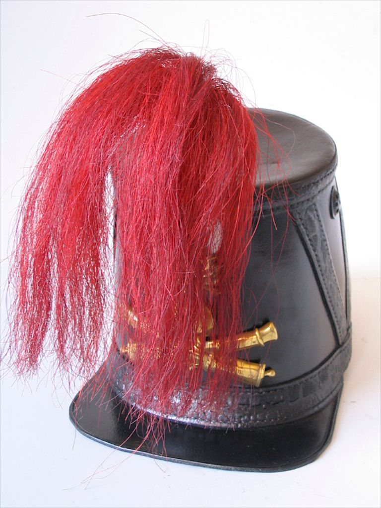 Le corps de la coiffe est en forme de cône oblique tronqué avec renforts de cuir en V sur les côtés, la visière carrée est à face interne verte, la plaque est en laiton et l’aigrette retombante rouge écarlate est montée sur un coquillage de même couleur, le tout est surmonté d’une cocarde bleu-blanc-rouge, la mentonnière a plusieurs crans de règlage, un crochet recourbé est attaché sur l’arrière de la coiffe.