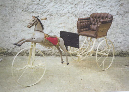 Matière et technique : voitures à pédales en carton, bois, tôle et fer