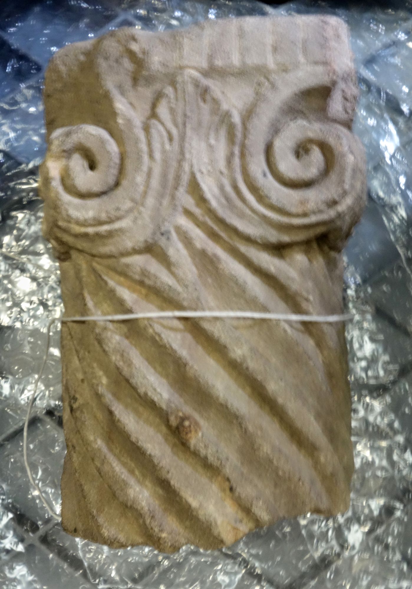 Colonnette (pied de poêle ?), ronde, torsadée, avec chapiteau stylisé. Découverte rue des Serruriers à Strasbourg.