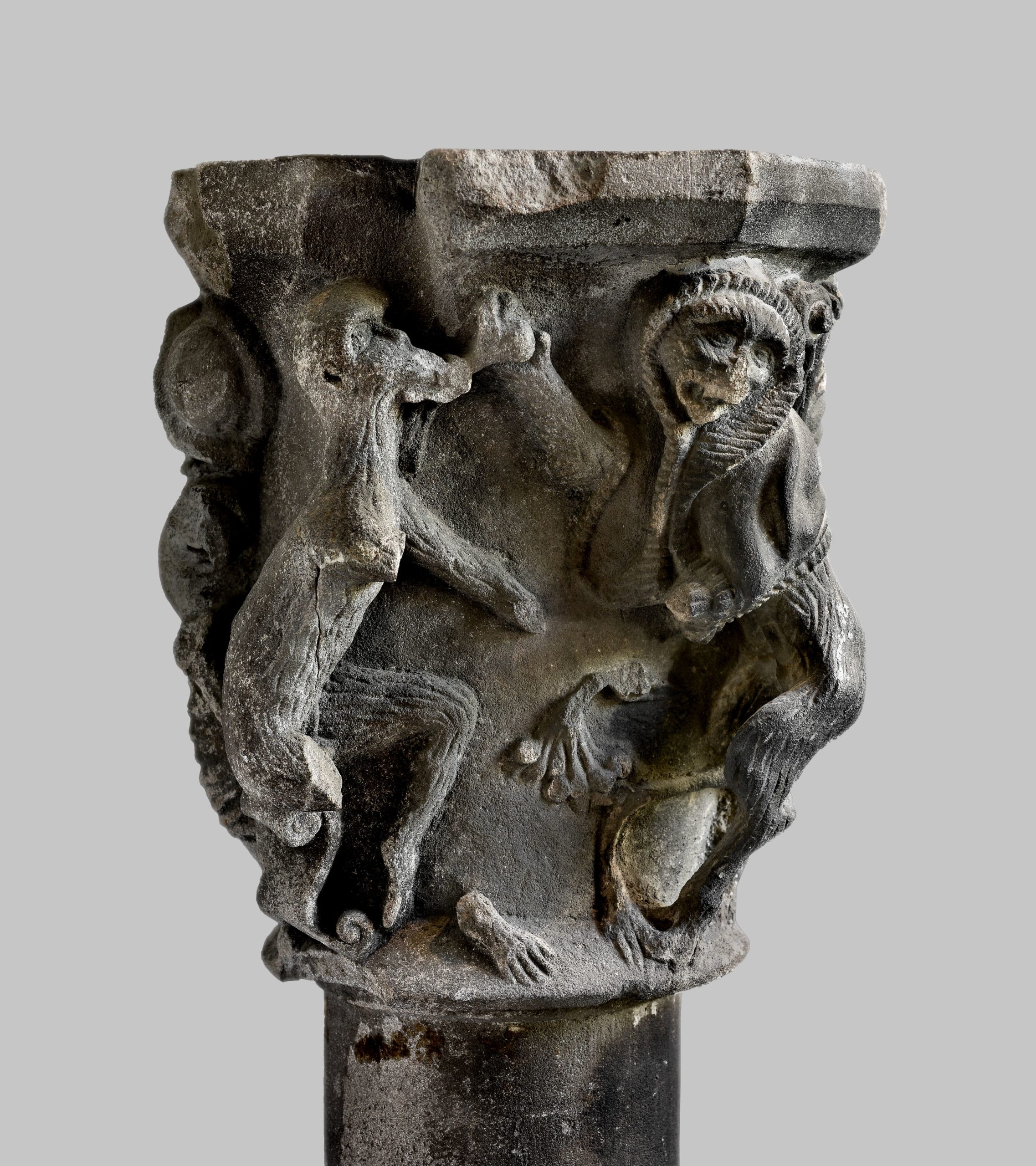 Colonnette à chapiteau à personnages : singe dansant et moine.