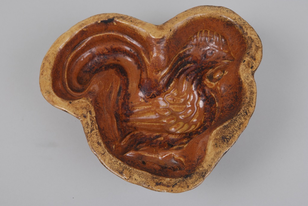 Moule en forme de coq. Pièce moulée à parois épaisses et verticales. Décor intérieur en creux. Intérieur vernissé ocre jaune.
