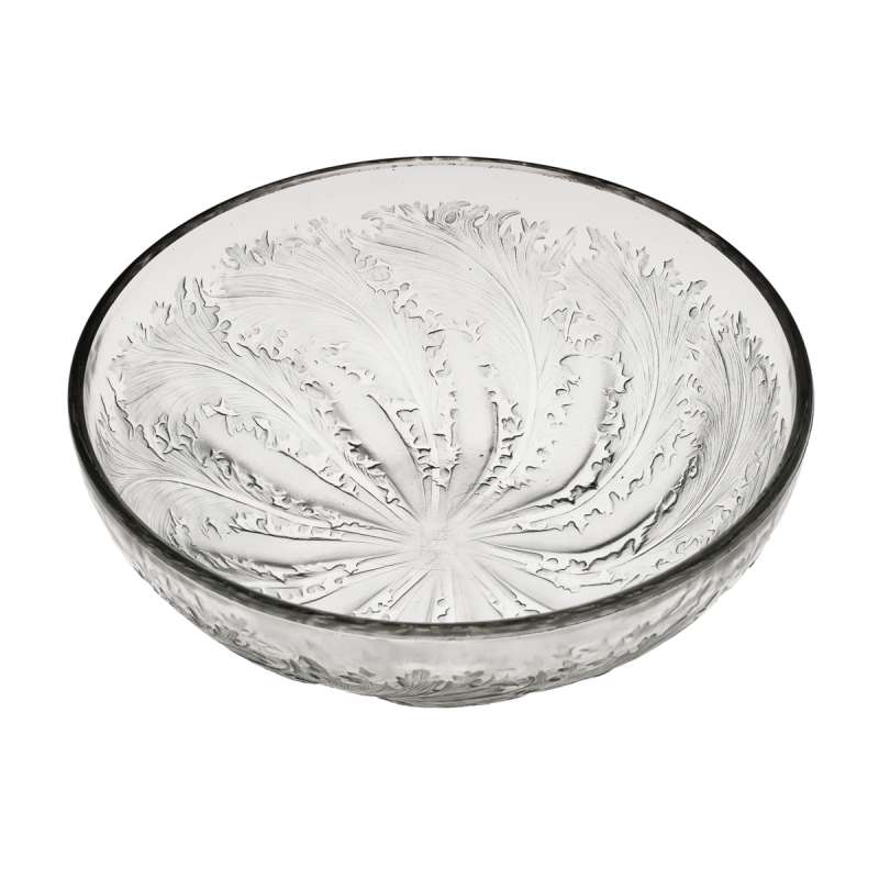 Coupe en verre blanc patiné gris, elle permet d’illustrer l’intérêt de René Lalique pour la flore. Le motif Chicorée est un inédit dans la production de l’artiste. Cette pièce est signée VDA pour Verrerie d’Alsace, nom de la verrerie de René Lalique à Wingen-sur-Moder. Cette signature est abandonnée dès 1923 au profit de la signature R. Lalique.