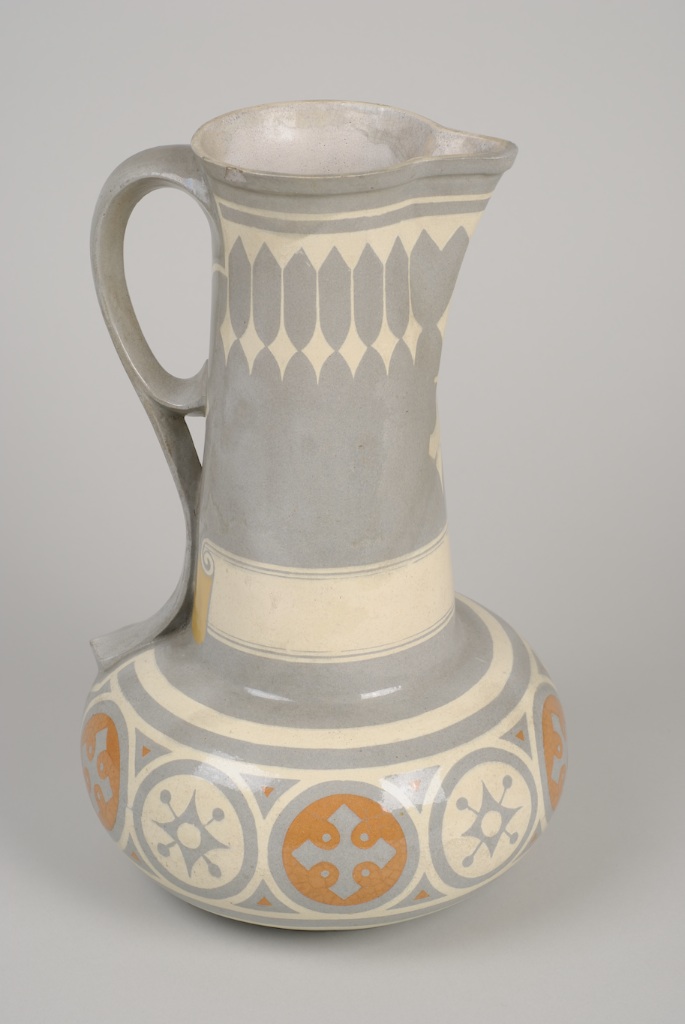 Cruche à long col flanqué d’une anse. Fond gris, décor géométrique ivoire et rouille. Le musée possède le dessin original de Dock représentant cette cruche. Le dessin est signé et daté « E. DOCK 1859 ».