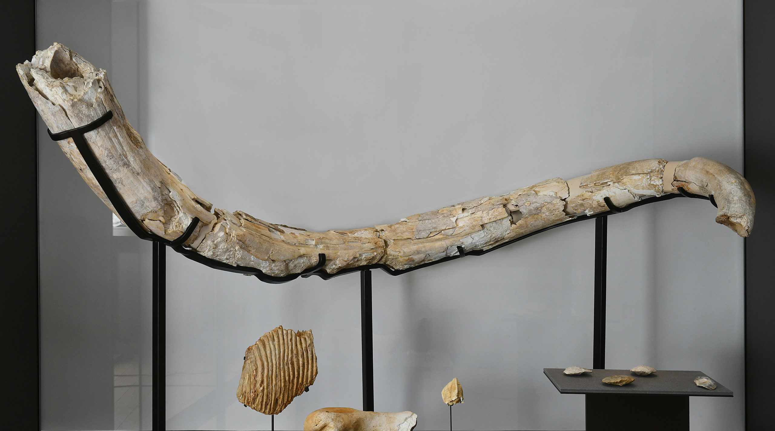 Espèce aujourd’hui éteinte, le mammouth était un mammifère cousin de l’éléphant moderne. Il est apparu avant l’être humain, il y a environ 2,5 millions d’années, au début du Quaternaire. Cette période géologique se caractérise par des cycles glaciaires ; le mammouth est donc parfaitement adapté au froid. Il côtoie alors le rhinocéros laineux, le tigre à dents de sabre ou encore l’ours des cavernes. Puis, alors que le climat se réchauffe, le mammouth cohabite avec l’Homme préhistorique. En attestent les nombreuses représentations mises au jour dans les grottes du Paléolithique. L’Homme consomme la viande de l’animal, notamment en élaborant des techniques de chasse en groupe et en pratiquant le charognage. Il exploite également sa graisse, ses os, sa peau ainsi que l’ivoire de ses défenses. Très imposantes, ces dernières peuvent mesurer jusqu’à quatre mètres de longueur.