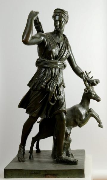 Copie de la Diane de Versailles (musée du Louvre), Diane tire une flèche de son carquois de la main droite et de la main gauche tient un jeune cerf par les cornes.