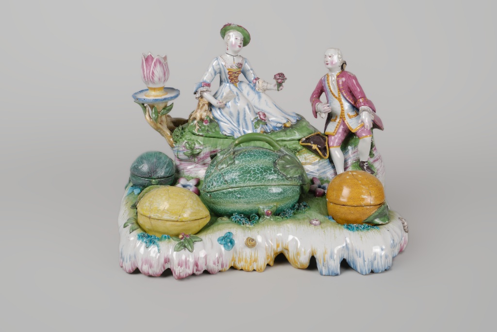 Réservoir en forme de fruits et légumes, porte-chandelle forme tulipe. SP: Encrier faisant pendant à une pièce déjà au musée, exemplaire complet. Aux approches de 1750 et jusqu’à sa mort en 1760, la production de Paul Hannong s’intensifie et se développe considérablement: terrines en forme de volatiles, de hures de sanglier, plats en trompe-l’œil, drageoirs en forme de fruits ou de fleurs, encriers à décor plastique … Véritable synthèse du goût de l’époque pour les statuettes évoquant la bergerie et pour les drageoirs en forme de fruits, cet encrier témoigne d’une tentative fort amusante de dépasser le stade d’un récipient muni de godets et de trous pour parvenir à une composition décorative complexe où la rutilance des coloris ne le cède en rien à l’exubérance des divers récipients tenant lieu de réservoir pour l’encre et la poudre, en ajoutant même une tulipe en guise de bougeoir. Le musée avait acquis en 1978 un autre exemplaire d’encrier, dont la base – un talus herbeux – est la même, ainsi que la disposition générale des récipients, mais dont presque tous les éléments de détail diffèrent, intéressant témoignage des variations imaginées par les modeleurs sur un thème donné.
