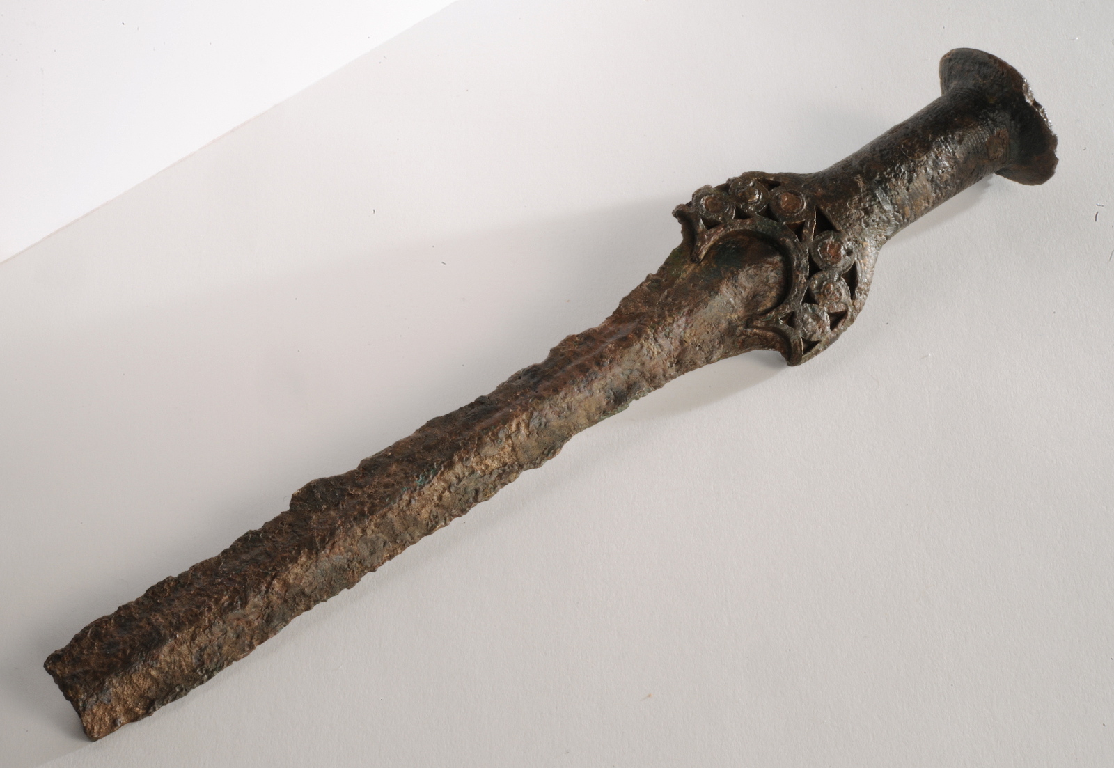 L’âge du Bronze se distingue par un nouveau mode de gestion des ressources et le développement d’une nouvelle technologie : la métallurgie du bronze, un métal obtenu par alliage du cuivre et de l’étain. Il permet la création de parures, la fabrication de nouveaux instruments agraires et de nouvelles armes, comme l’épée ou le bouclier. L’épée de Sion a été découverte, au XIXe siècle, près de la vallée de la Moselle, au niveau d’une de ces très anciennes voies d’échange qui relie la Méditerranée exportatrice de cuivre et le nord de l’Europe producteur d’ambre de la Baltique. Son contexte archéologique nous est inconnu mais d’après sa typologie, elle est datée de la période du Bronze moyen, entre 1500 et 1300 avant notre ère. La Lorraine est alors située dans l’ère d’influence de la civilisation des tombes sous tumulus (éminence artificielle). Cette épée est constituée d’une lame à nervure centrale et d’une poignée en bronze à décor ajouré dotée de six rivets portant un décor solaire spiralé. La garde est très échancrée en forme de croissant de lune. Il s’agit d’une pièce importée provenant du nord de l’Europe, probablement de Scandinavie, une aire culturelle très dynamique qui a produit de nombreux objets en bronze très originaux.