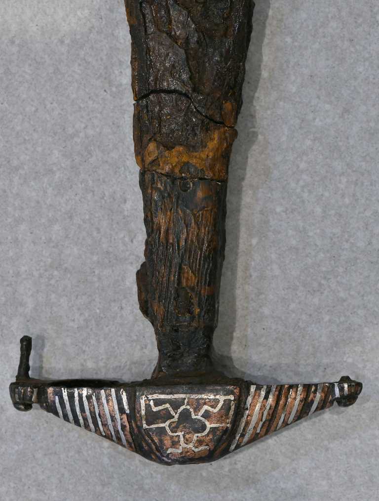 Cette épée a été retrouvée au sein d’une sépulture attribuée à un chef guerrier. La tombe contenait un mobilier exceptionnel : le corps était déposé dans un sarcophage en plâtre, accompagné de nombreuses armes de très belle facture. L’épée, datée de la seconde moitié du 6e siècle, était déposée à côté du défunt, la courroie de suspension enroulée autour de l’arme. Le pommeau de l’épée et les gouttières latérales de son fourreau sont décorés d’une rare damasquinure en argent sur alliage cuivreux. Très utilisée à l’époque mérovingienne, cette technique d’orfèvrerie consiste à incruster un fil de cuivre, d’or ou d’argent sur une surface métallique. Le motif ornemental est préalablement creusé puis le fil est introduit dans la rainure par martelage.