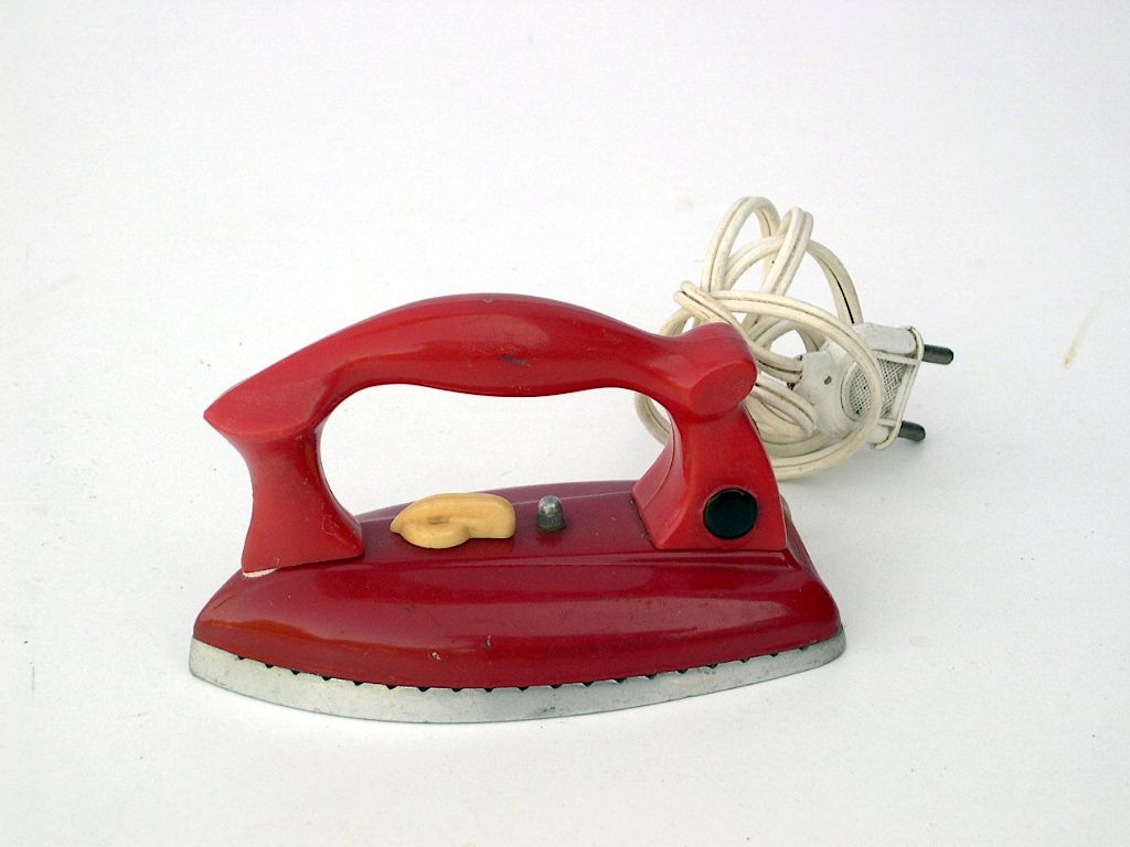 Semelle métallique, corps et poignée fermée en plastique rouge, faux thermostat en plastique clair, cordon blanc.