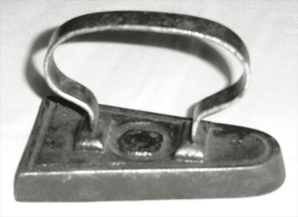 Fer à repasser jouet. Fer à repasser composé d’une semelle lisse triangulaire à la pointe arrondie et à l’arrière droit. Une poignée polie est sertie sur la semelle. La semelle porte un motif décoratif de monogramme, indistinct.