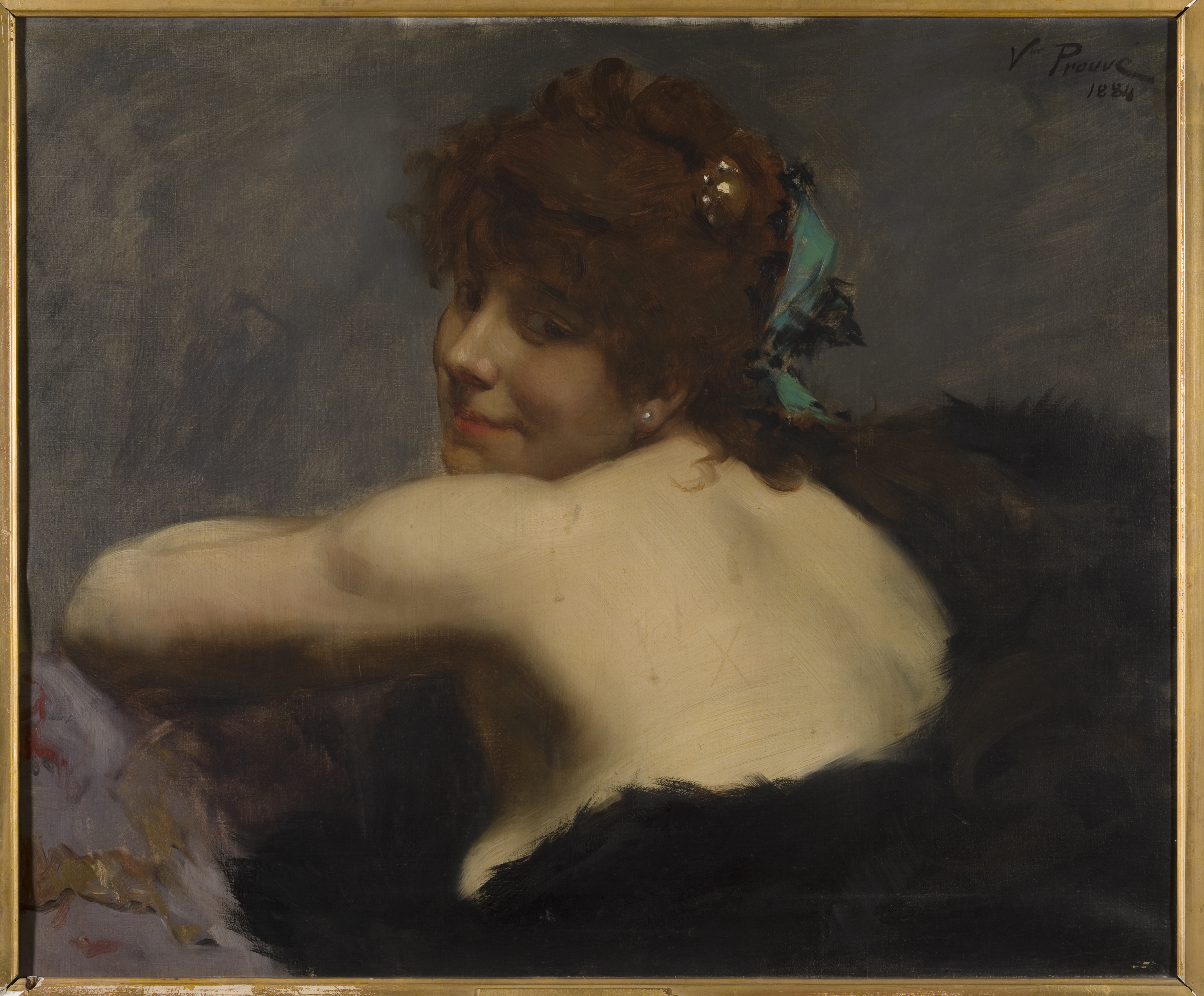 Buste de femme de trois quart dos, la tête tournée vers le spectateur.