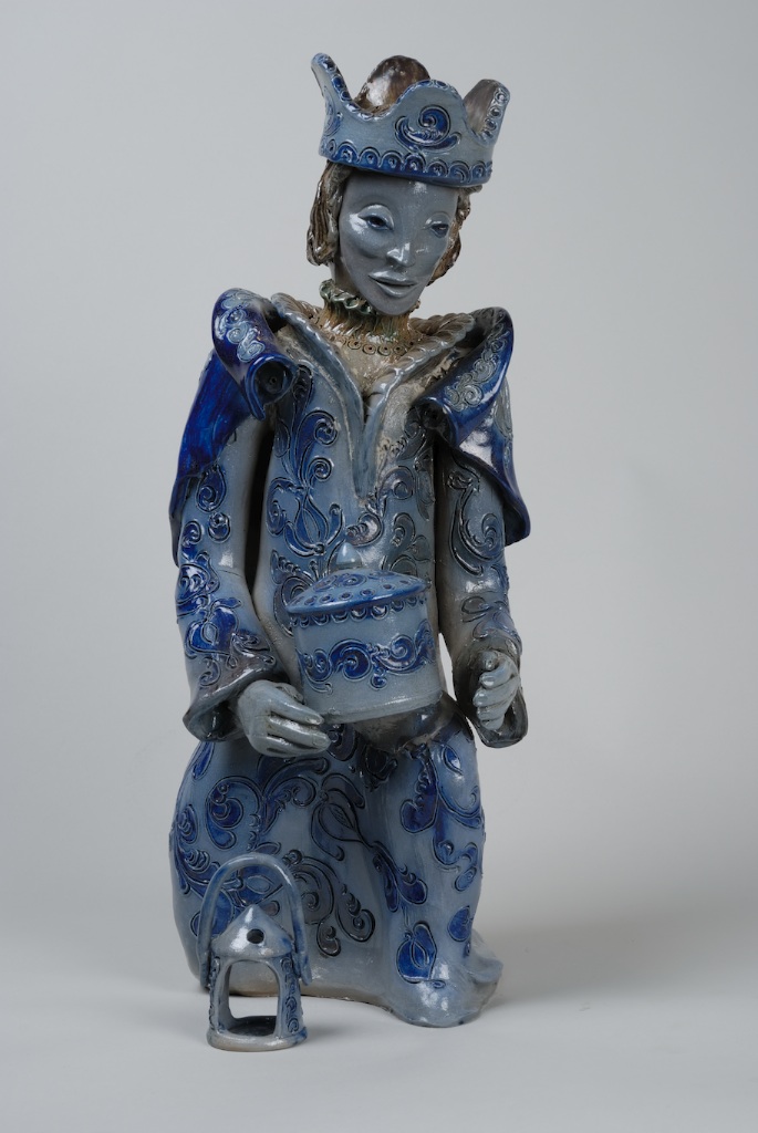 Figurine de crèche représentant un roi mage, agenouillé, en grès au sel de Betschdof, creux à l’intérieur. Sa main droite est tendue en avant, ouverte. De sa main gauche, il tient une boîte ronde munie d’un couvercle avec bouton de préhension. Son manteau est richement décoré de rinceaux fleuris. Fraise et collier autour du cou. Très belle couronne sur la tête avec décor imitant des incrustations de pierres précieuses. Décor au stylet. Teinte au bleu de cobalt.