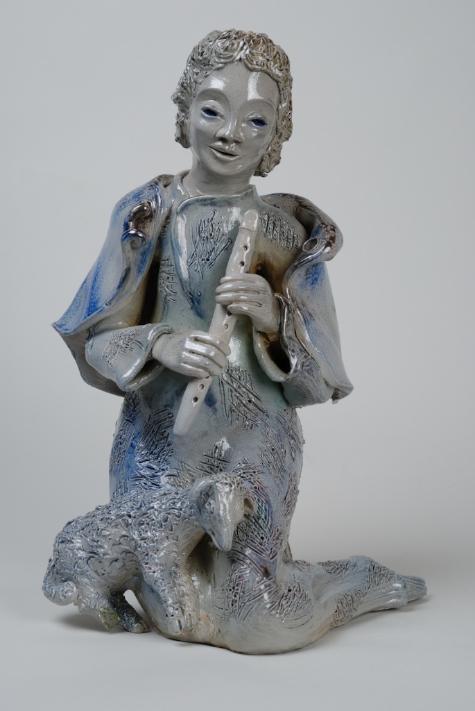 Deux figurines de crèche représentant la Vierge Marie et l’enfant-Jésus en grès au sel de Betschdof, creux à l’intérieur. Marie est agenouillée tenant ses deux mains en avant, ouvertes, tournées vers l’intérieur. Enfant-Jésus, souriant, deux mains le long du corps. Décor des personnages incisé au stylet et peint au bleu de cobalt : rinceaux de fleurs et paillettes.