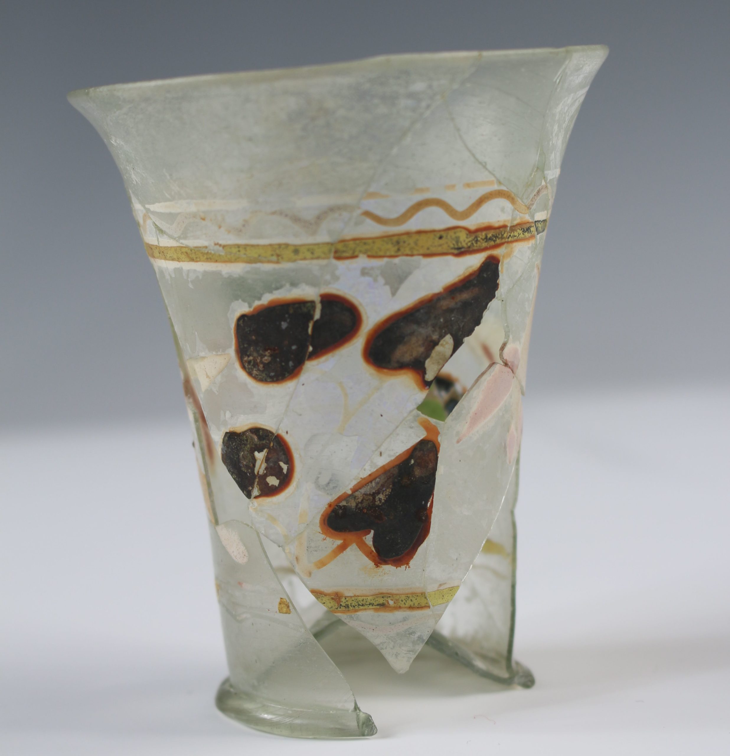 Verre trouvé en contexte de fouille sur le site de Sarrebourg, rue de la Paix en 2004. De forme tronconique, soufflé et émaillé, il provient d’une verrerie vénitienne avec des techniques d’émaillage apportées probablement par des verriers d’origine syrienne. Le verre est incolore et d’excellente qualité. Le fond refoulé est souligné par un filet lisse rapporté. Les parois sont fines et la lèvre est ronde. Le motif décoratif, répété deux fois, est composé d’un oiseau et de quatre feuilles cordiformes. Extérieurement, la couleur des émaux a changé sous l’action corrosive du milieu, mais, intérieurement, il est encore possible de voir, par transparence, la couleur initiale des émaux protégés par le verre. Les feuilles sont alors vertes (marron-brun à l’extérieur) et les ailes des oiseaux sont rouges (devenues roses). Les motifs feuilles ou oiseau sont dessinés d’un trait blanc. Le milieu de la surface obtenue est ensuite rempli d’émail de la couleur voulue. Les détails comme les yeux sont repris en traits bruns sur la surface peinte. Le motif décoratif est encadré, en haut et en bas par deux bandes jaunes bordées de blanc puis par une ligne en zigzag blanche ou grise. Ces verres émaillés sont rares en France. Les seules comparaisons proviennent de Strasbourg. Le fond ancien du musée de Metz en conserve un fragment. Des exemples bien plus nombreux sont connus en Allemagne et aux Pays-Bas ou en Angleterre.