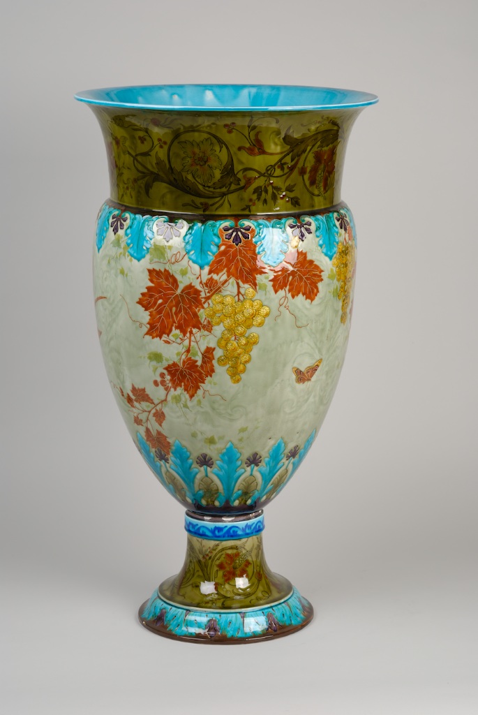 Col et pied: entrelacs de fleurs et de feuillages stylisées sur fond vert avec bordures bleu Deck. Sur la panse: grappes de raisins rehaussées d’or, feuilles de vigne rouges sur fond céladon, oiseaux et papillons rehaussés d’or. Pièce de choix à l’Exposition Universelle de 1889 au stand de la maison Deck.